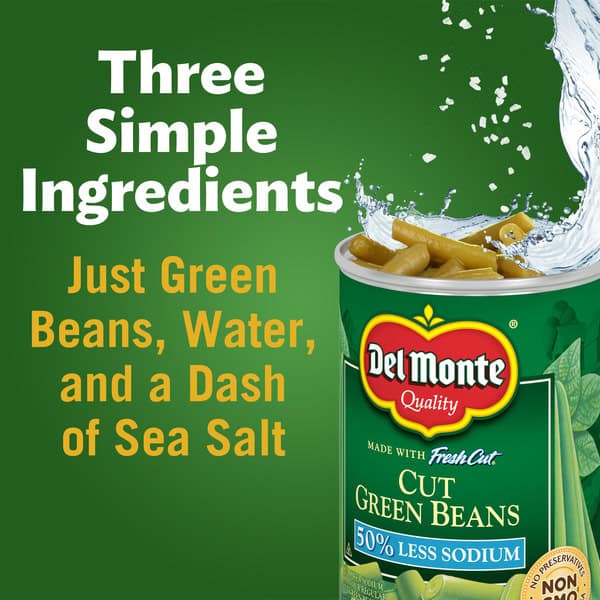 DEL MONTE FRESH CUT BLUE LAKE Low Sodium Cut Green Beans Canned Vegetables make it easy to enjoy high quality greens with your home meals in minutes. Grown in the U.S.A. and harvested at peak freshness, these nutrient dense canned green beans are specially packed to seal in the rich, delicious green bean flavor. With just a hint of natural sea salt, these BLUE LAKE DEL MONTE green beans are a sweet addition to any vegetable based meal. DEL MONTE canned cut green beans are a simple ready to eat side dish that goes with any meal, without sacrificing on quality. Effortlessly create green bean casserole for the holidays or serve a side of green beans with your favorite chicken dish using these canned green beans. BLUE LAKE green beans have 50% less sodium* than our regular green beans, are Non-GMO** and contain no artificial preservatives for an amazing wholesome vegetables taste that complements any homemade dish. Bring the wholesome goodness of the earth to your dinner table with DEL MONTE BLUE LAKE Canned Green Beans. *Contains 190mg sodium per serving compared to 380mg in our regular cut green beans. **Ingredients of the types used in this product are not genetically modified.