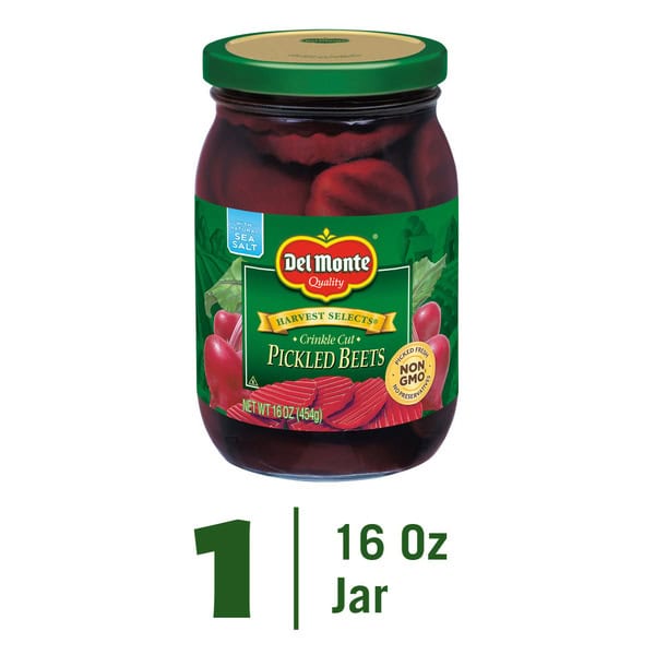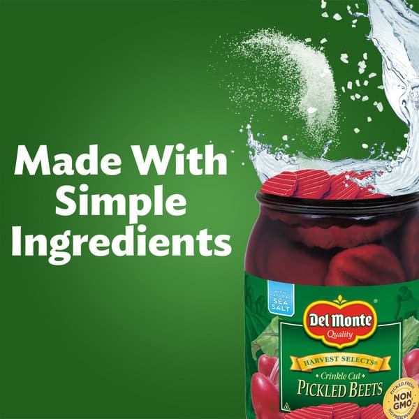 DEL MONTE HARVEST SELECTS Crinkle Cut Pickled Beets are picked at the peak of ripeness for unsurpassed flavor in every bite. These Non-GMO* ready to eat beets contain no artificial preservatives and are seasoned with natural sea salt, making them a convenient, wholesome snack and recipe addition. Prized for their deep red color and tangy flavor, these sliced pickled beets brighten your plate as a tasty and nutritious side dish or color complement to a garden salad. The crinkle cut brings texture and visual interest to a variety of side dishes, including three bean salad and pickled beet and cucumber salad. Each jar is easy to reseal, letting you enjoy a few of these ready to eat beets and save the rest for later. Bring the natural goodness of the earth to your dinner table with DEL MONTE sliced pickled beets. *Ingredients of the types used in this product are not genetically modified.