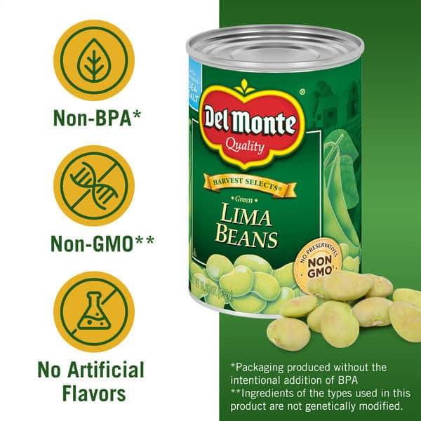 DEL MONTE HARVEST SELECTS FRESH CUT Green Lima Beans, Canned Vegetables make it easy to enjoy high quality vegetables with your home meals in minutes. Grown in the U.S.A. and harvested at peak freshness, these canned butter beans are specially packed to seal in the crisp, ripe flavor. With just a hint of natural sea salt, these DEL MONTE lima beans are a tasty addition to any vegetable based meal. DEL MONTE canned lima beans are a simple, ready to eat side dish that goes with any meal, without sacrificing on quality. Add the seasoned lima beans to vegetable medley, serve them alongside fettuccine alfredo, or enjoy a bean salad with dinner. The heat and serve lima beans are Non-GMO* and contain no preservatives for an amazing wholesome vegetables taste that complements any homemade dish. Bring the natural goodness of the earth to your dinner table with DEL MONTE FRESH CUT canned legumes. *Ingredients of the types used in this product are not genetically modified.