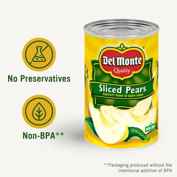 DEL MONTE Sliced Bartlett Pears in Heavy Syrup make it easy to enjoy high quality fruit in minutes. These canned pears are packed with delicious, ripe pears in heavy syrup for a ready to eat fruit snack you can feel good about. DEL MONTE canned pears contain no artificial preservatives, making them a convenient, wholesome and ready to eat fruit option for busy nights. Picked and packed at the peak of ripeness and immersed in heavy syrup, this canned fruit is ideal as part of a quick lunch snack or as a flavorful addition to fruit salad or fruit cocktail. Each Non-BPA* fruit can stores well in a pantry or cabinet for a convenient fruit snack whenever you need delicious fruit on-the-go. Bring the wholesome goodness of the Earth to your family with DEL MONTE Pears. *Packaging produced without the intentional addition of BPA.