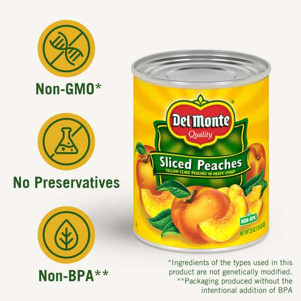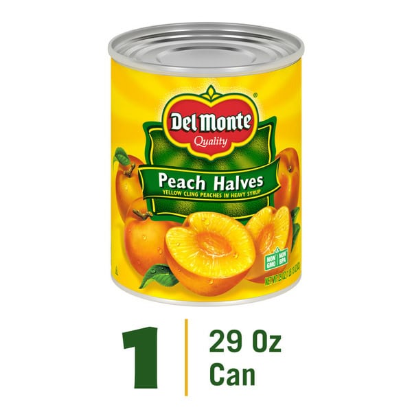 DEL MONTE Yellow Cling Peach Halves in Heavy Syrup make it easy to enjoy high quality fruit in minutes. These peach halves are packed with delicious, ripe peaches in heavy syrup for a fruit snack you can feel good about. DEL MONTE peaches contain no artificial preservatives, making them a convenient, wholesome and ready to eat fruit option for busy nights. Picked and packed at the peak of freshness and immersed in heavy syrup, this canned fruit is ideal as part of a quick lunch snack or as a flavorful peach pie filling or addition to fruit salad. For more delicious options, try using the canned peach halves to make peach jam. Each Non-BPA* can stores well in a pantry or cabinet for a convenient fruit snack whenever you need delicious fruit on-the-go. Bring the wholesome goodness of the Earth to your family with DEL MONTE Peaches. *Packaging produced without the intentional addition of BPA.
