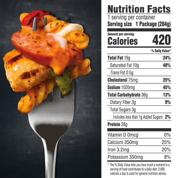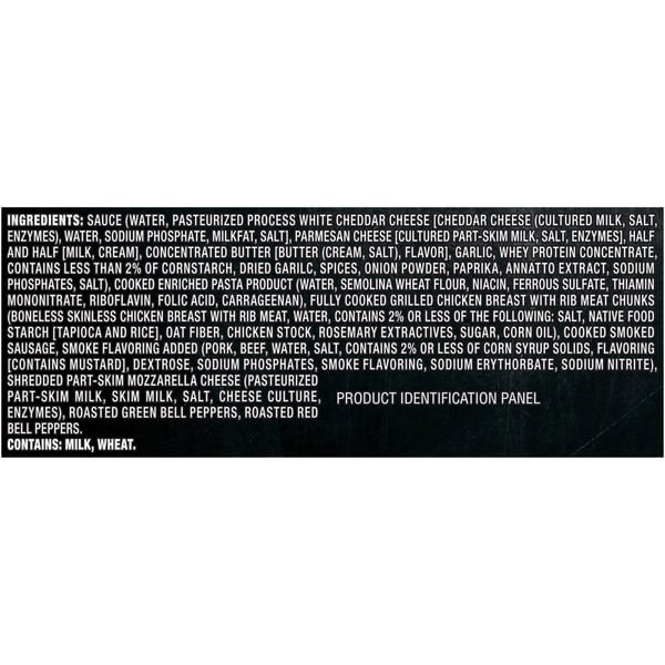 Sauce (water, Pasteurized Process White Cheddar Cheese [cheddar Cheese (cultured Milk, Salt, Enzymes), Water, Sodium Phosphate, Milkfat, Salt], Parmesan Cheese [cultured Part-skim Milk, Salt, Enzymes], Half And Half [milk, Cream], Concentrated Butter [butter (cream, Salt), Flavor], Garlic, Whey Protein Concentrate, Contains Less Than 2% Of Cornstarch, Dried Garilc, Spices, Onion Powder, Paprika, Annatto Extract, Sodium Phosphates, Salt), Cooked Enriched Pasta Product (water, Semolina Wheat Flour, Niacin, Ferrous Sulfate, Thiamin Mononitrate, Riboflavin, Folic Acid, Carrageenan), Fully Cooked Grilled Chicken Breast With Rib Meat Chunks (boneless Skinless Chicken Breast With Rib Meat, Water, Contains 2% Or Less Of The Following: Salt, Native Food Starch [tapioca And Rice], Oat Fiber, Chicken Stock, Rosemary Extractives, Sugar, Corn Oil), Cooked Smoked Sausage, Smoke Flavoring Added (pork, Beef, Water, Salt, Contains 2% Or Less Of Corn Syrup Solids, Flavoring [contains Mustard], Dextrose, Sodium Phosphates, Smoke Flavoring, Sodium Erythorbate, Sodium Nitrite), Shredded Part-skim Mozzarella Cheese (pasteurized Part-skim Milk, Skim Milk, Salt, Cheese Culture, Enzymes), Roasted Green Bell Peppers, Roasted Red Bell Peppers.