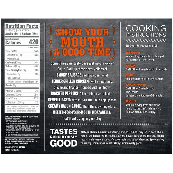 DEVOUR Cajun Style Alfredo With Sausage & Chicken dials up the taste, maxes out the flavor and turns up the texture in an easy-to-make single serve frozen tv dinner. Our hearty Cajun chicken pasta frozen dinners are sure to satisfy big appetites. Each savory microwave meal is packed with slices of smoked sausage, hearty slices of tender grilled chicken and perfectly roasted peppers all piled over a bed of gemelli pasta with curves to sop up that mouthwatering creamy Cajun Alfredo sauce. Ready to eat in minutes, each single serve 10 ounce dinner comes in a microwaveable serving tray for fast and convenient feasting. DEVOUR frozen meals make it easy to enjoy hot, mouthwatering food at home or in the break room, so be sure to keep your freezer stocked with our delicious frozen food. Excite your taste buds with our incredible Cajun style frozen dinner.