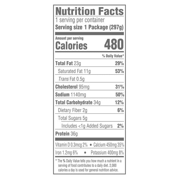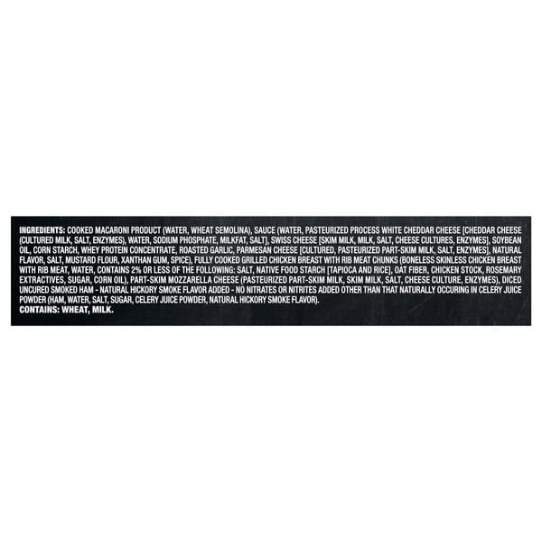Cooked Macaroni Product (water, Wheat Semolina), Sauce (water, Pasteurized Process White Cheddar Cheese [cheddar Cheese (cultured Milk, Salt, Enzymes), Water, Sodium Phosphate, Milkfat, Salt], Swiss Cheese [skim Milk, Milk, Salt, Cheese Cultures, Enzymes], Soybean Oil, Corn Starch, Whey Protein Concentrate, Roasted Garlic, Parmesan Cheese [cultured, Pasteurized Part-skim Milk, Salt, Enzymes], Natural Flavor, Salt, Mustard Flour, Xanthan Gum, Spice), Fully Cooked Grilled Chicken Breast With Rib Meat Chunks (boneless Skinless Chicken Breast With Rib Meat, Water, Contains 2% Or Less Of The Following: Salt, Native Food Starch [tapioca And Rice], Oat Fiber, Chicken Stock, Rosemary Extractives, Sugar, Corn Oil), Part-skim Mozzarella Cheese (pasteurized Part-skim Milk, Skim Milk, Salt, Cheese Culture, Enzymes), Diced Uncured Smoked Ham – Natural Hickory Smoke Flavor Added – No Nitrates Or Nitrites Added Other Than That Naturally Occurring In Celery Juice Powder (ham, Water, Salt, Sugar, Celery Juice Powder, Natural Hickory Smoke Flavor)