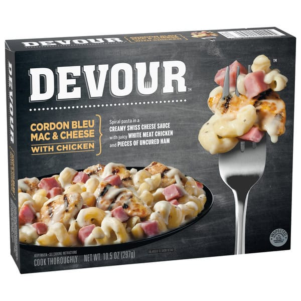 • DEVOUR Chicken Cordon Bleu Mac & Cheese frozen dinners are ready in minutes