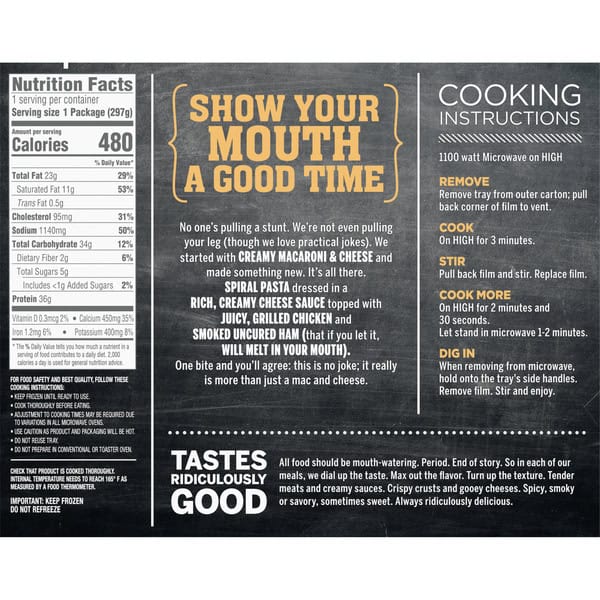 DEVOUR Chicken Cordon Bleu Mac & Cheese dials up the taste, maxes out the flavor and turns up the texture in an easy-to-make single serve frozen meal. Our savory pasta frozen dinner includes everything you crave from the classic mac and cheese. Each 10.5 ounce microwave meal is packed with spiral pasta topped with juicy grilled chicken and perfectly smoked ham, in a thick and creamy cheese sauce made from Swiss and Provolone cheese. Ready to eat in minutes, it includes a cooking tray that ensures your dish is cooked to the fullest. DEVOUR frozen meals make it easy to enjoy hot, mouth-watering food at home or in the break room, so be sure to keep your freezer stocked with our delicious frozen food. Keep DEVOUR Chicken Cordon Bleu Mac & Cheese in the freezer for an always ridiculously good meal day or night. Show your mouth a good time!