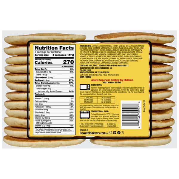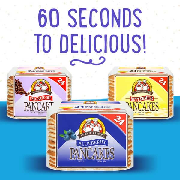 When your family wants a delicious meal at breakfast time, reach for De Wafelbakkers Buttermilk Pancakes. Premade, frozen pancakes are ready to warm so you can enjoy the delicious taste and fluffy texture of buttermilk pancakes without the mess. Made with quality ingredients, these pancakes are a great choice for family dinner or breakfast. To prepare, simply warm the desired number of pancakes in the oven or microwave according to the time on the pack. Enjoy the classic taste of buttermilk pancakes, ready to eat in seconds. Top the warm pancakes with pancake syrup, or add whipped cream and your favorite fruit for an extra special frozen breakfast food. You can even use these as fun frozen family meals by making pancake creations like breakfast sandwiches or pancake tacos. This 24 count pack of De Wafelbakkers Buttermilk Pancakes has plenty of pancakes for many breakfasts or family dinners. Homemade taste in just 60 seconds – De Wafelbakkers Frozen Pancakes has been providing families with great mornings for over 30 years. Attack the Stack!
