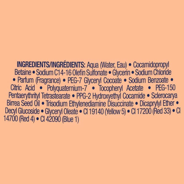Water, Sodium Laureth Sulfate, Cocamidopropyl Betaine, Peg-8, Sodium Chloride, Fragrance, Sodium Benzoate, Polyquaternium-7, Citric Acid, Peg-7 Glyceryl Cocoate, Glycerin, Peg-200 Hydrogenated Glyceryl Palmate, Laureth-2, Sodium Sulfate, Dmdm Hydantoin, Tetrasodium Edta, Sclerocarya Birrea Seed Oil, Dicaprylyl Ether, Decyl Glucoside, Glyceryl Oleate, Ci 19140 (yellow 5), Ci 17200 (red 33), Ci 14700 (red 4), Ci 42090 (blue 1)