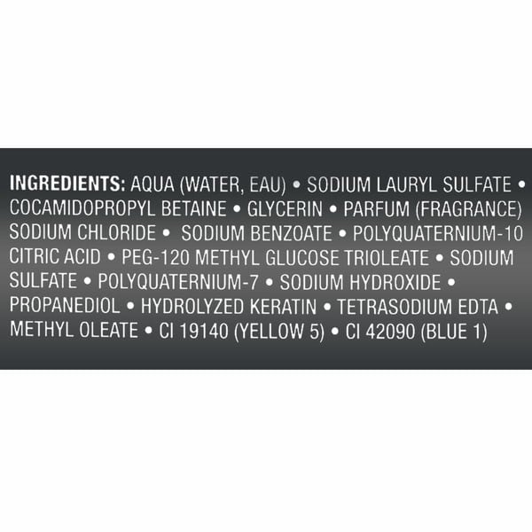 Aqua (water), Sodium Laureth Sulfate, Cocamidopropyl Betaine, Sodium Chloride, Glycerin, Parfum (fragrance), Polyquaternium-7, Peg-7 Glyceryl Cocoate, Hydrolyzed Keratin, Caffeine, Peg-200 Hydrogenated Glyceryl Palmate, Cocamide Mea, Sodium Benzoate, Citric Acid, Laureth-2, Sodium Sulfate, Dmdm Hydantoin, Tetrasodium Edta, Ci 19140 (yellow 5), Ci 42090 (blue 1)