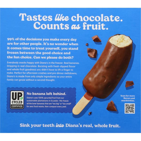 ABOUT DIANA’S. Diana’s pioneered frozen chocolate covered fruit before the internet was a thing and is the first frozen snack to be Certified Upcycled with a devotion to sustainable food creations. With a commitment to make better-for-you, gluten-free snacking convenient and easy, Diana’s carefully curates premium real food ingredients to create flavor and texture combinations everyone can love.