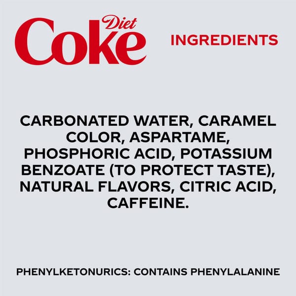 Carbonated Water, Caramel Color, Aspartame, Phosphoric Acid, Potassium Benzoate (to Protect Taste), Natural Flavors, Citric Acid, Caffeine.