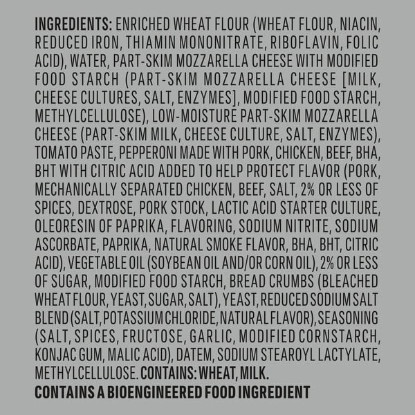 Cheese Stuffed Crust (enriched Flour [wheat Flour, Niacin, Reduced Iron, Thiamine Mononitrate, Riboflavin Folic Acid], Part-skim Mozzarella Cheese With Methylcellulose [{pasteurized Milk, Cultures, Salt, Enzymes}, Modified Food Starch, Methylcellulose], Water, Soybean Oil, Sugar, Breadcrumbs [bleached Wheat Flour, Yeast, Sugar, Salt], Yeast, Salt Blend [salt, Potassium Salt, Natural Flavor], Sodium Stearoyl Lactylate, Datem), Low-moisture Part-skim Mozzarella Cheese (cultured Part-skim Milk, Salt, Enzymes), Low-moisturepart-skim Mozzarella Cheese With Modified Food Starch (low-moisture Part-skim Mozzarella Cheese [milk, Cheese Cultures, Salt, Enzymes], Modified Food Starch, Nonfat Milk, Natural Flavors, Annatto [color]), Water, Tomato Paste, Pepperoni Made With Pork, Chicken And Beef (pork, Mechanically Separated Chicken, Beef, Salt, Contains 2% Or Less Of Spices, Dextrose, Pork Stock, Lactic Acid Starter Culture, Oleoresin Of Paprika, Flavoring, Sodium Nitrite, Sodium Ascorbate, Paprika, Processed With Natural Smoke Flavor, Bha, Bht, Citric Acid To Help Protect Flavor), 2% Or Less Of Vegetable Oil (soybean Oil And/or Corn Oil), Salt, Spices, Fructose, Garlic, Konjacgum, Modified Food Starch, Malic Acid.