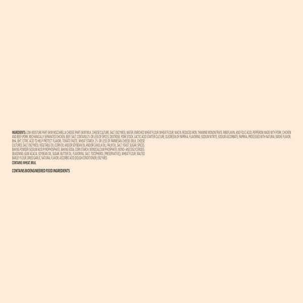 Low-moisture Part-skim Mozzarella Cheese (part-skim Milk, Cheese Culture, Salt, Enzymes), Water, Enriched Wheat Flour (wheat Flour, Niacin, Reduced Iron, Thiamine Mononitrate, Riboflavin, And Folic Acid), Pepperoni Made With Pork, Chicken And Beef (pork, Mechanically Separated Chicken, Beef, Salt, Contains 2% Or Less Of Spices, Dextrose, Pork Stock, Lactic Acid Starter Culture, Oleoresin Of Paprika, Flavoring, Sodium Nitrite, Sodium Ascorbate, Paprika, Processed With Natural Smoke Flavor, Bha, Bht, Citric Acid To Help Protect Flavor), Tomato Paste, Wheat Starch, 2% Or Less Of Parmesan Cheese (milk, Cheese Cultures, Salt, Enzymes), Vegetable Oil (corn Oil And/or Soybean Oil And/or Canola Oil), Palm Oil, Salt, Yeast, Sugar, Spices, Baking Powder (sodium Acid Pyrophosphate, Baking Soda, Corn Starch, Monocalcium Phosphate), Mono- And Diglycerides, Seasoning (gum Acacia, Soybean Oil, Sugar, Butter Oil, Flavoring, Salt, Tocopherol [preservative]), Wheat Flour, Malted Barley Flour, Dried Garlic, Natural Flavor, Ascorbic Acid (dough Conditioner), Enzymes