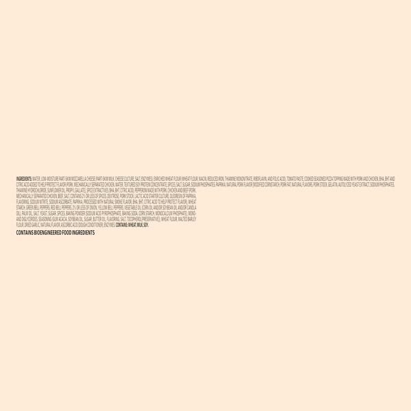 Water, Low-moisture Part-skim Mozzarella Cheese (part-skim Milk, Cheese Culture, Salt, Enzymes), Enriched Wheat Flour (wheat Flour, Niacin, Reduced Iron, Thiamine Mononitrate, Riboflavin, And Folic Acid), Tomato Paste, Cooked Seasoned Pizza Topping Made With Pork And Chicken, Bha, Bht And Citric Acid Added To Help Protect Flavor (pork, Mechanically Separated Chicken, Water, Textured Soy Protein Concentrate, Spices, Salt, Sugar, Sodium Phosphates, Paprika, Natural Pork Flavor [modified Corn Starch, Pork Fat, Natural Flavors, Pork Stock, Gelatin, Autolyzed Yeast Extract, Sodium Phosphates, Thiamine Hydrochloride, Sunflower Oil, Propyl Gallate], Spice Extractives, Bha, Bht, Citric Acid), Pepperoni Made With Pork, Chicken And Beef (pork, Mechanically Separated Chicken, Beef, Salt, Contains 2% Or Less Of Spices, Dextrose, Pork Stock, Lactic Acid Starter Culture, Oleoresin Of Paprika, Flavoring, Sodium Nitrite, Sodium Ascorbate, Paprika, Processed With Natural Smoke Flavor, Bha, Bht, Citric Acid To Help Protect Flavor), Wheat Starch, Green Bell Peppers, Red Bell Peppers, 2% Or Less Of Onion, Yellow Bell Peppers, Vegetable Oil (corn Oil And/or Soybean Oil And/or Canola Oil), Palm Oil, Salt, Yeast, Sugar, Spices, Baking Powder (sodium Acid Pyrophosphate, Baking Soda, Corn Starch, Monocalcium Phosphate), Mono- And Diglycerides, Seasoning (gum Acacia, Soybean Oil, Sugar, Butter Oil, Flavoring, Salt, Tocopherol [preservative]), Wheat Flour, Malted Barley Flour, Dried Garlic, Natural Flavor, Ascorbic Acid (dough Conditioner), Enzymes.
