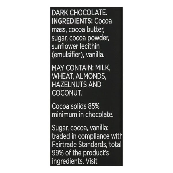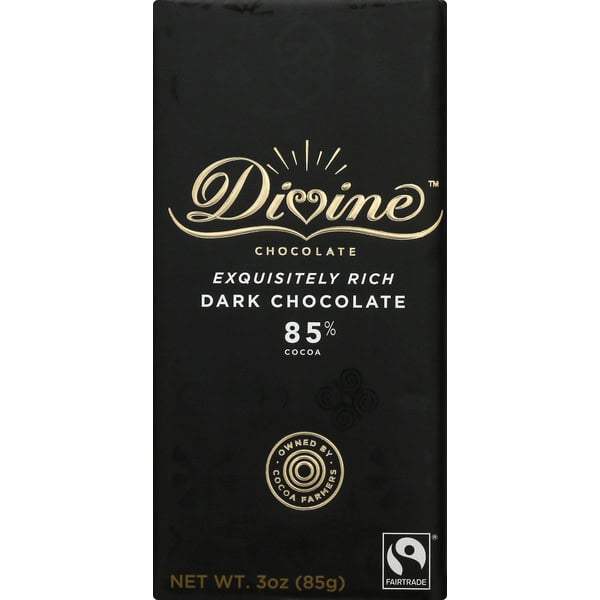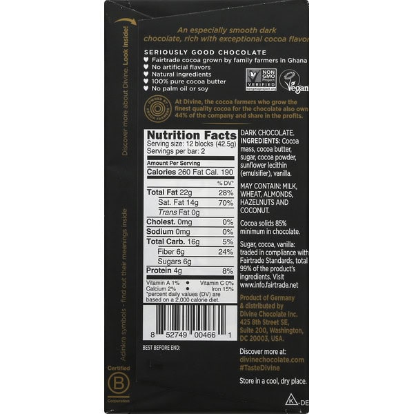An especially smooth dark chocolate, rich with exceptional cocoa flavor. No artificial flavors. Vegan. Non GMO Project verified. nongmoproject.org. Exquisitely rich. 85% Cocoa. Adinkra symbols – find out their meanings inside. Discover more about Divine. Look inside! Seriously Good Chocolate: natural ingredients; 100% pure cocoa butter; no palm oil or soy. divinechocolate.com. (hashtag)TasteDivine. Discover more at: divinechocolate.com. Certified B Corporation. Owned by Cocoa Farmers: At divine, the cocoa farmers who grow the finest quality cocoa for the chocolate also own 44% of the company and share in the profits. Fairtrade. Fairtrade cocoa grown by family farmers in Ghana. Cocoa solids 85% minimum in chocolate. Sugar, cocoa, vanilla: traded in compliance with Fairtrade Standards, total 99% of the product’s ingredients. Visit www.info.fairtrade.net. Product of Germany.