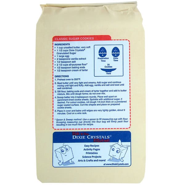 Classic Sugar Cookies: Ingredients: 1 cup unsalted butter, very soft. 1-1/2 cups Dixie Crystals granulated sugar. 1 large egg. 2 teaspoons vanilla extract. 1/2 teaspoon salt. 2-1/2 cups all-purpose flour (Spoon & Sweep method: Use a spoon to fill measuring cup with flour. Scooping measuring cup directly into flour bag will firmly pack flour resulting in too much flour for recipe). 1/2 teaspoon baking soda. 1/2 teaspoon cream of tartar. Directions: 1. Preheat oven to 350°F. 2. Beat butter until very light and creamy. Add sugar and continue mixing until light and fluffy. Add egg, vanilla and salt and beat until well combined. 3. Sift flour, baking soda and cream of tartar together and add to butter mixture. Mix until dough forms; do not over mix. 4. Scoop batter into 2-tablespoon rounds. Place well apart on parchment-lined cookie sheets. Sprinkle with additional sugar, if desired. For cutout cookies, roll dough 1/4-inch thick on a powdered sugar coated surface. Cut into shapes and place on prepared cookie sheets. 5. Place in oven and bake until edges are very lightly golden, about 9 minutes. Cool on a wire rack.