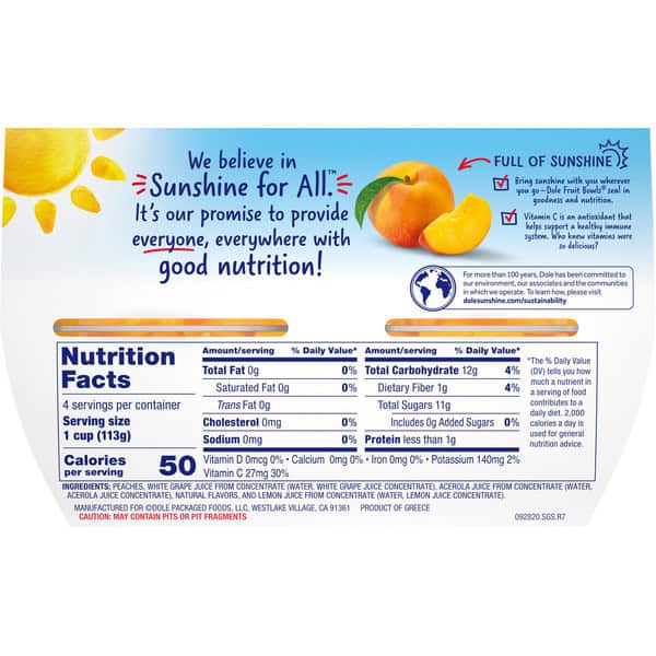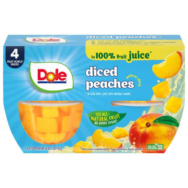• DOLE® FRUIT BOWLS® Diced Peaches in 100% Juice are an excellent source of Vitamin C, gluten free and made from all-natural fruit and non-GMO ingredients