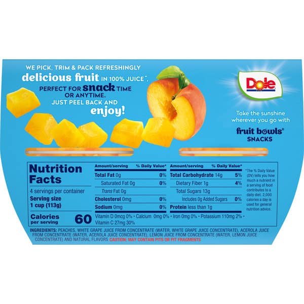 • DOLE® FRUIT BOWLS® Diced Peaches in 100% Juice are individually wrapped, making them a perfect, convenient snack to take on the go