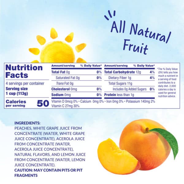 Peaches, White Grape Juice From Concentrate (water, White Grape Juice Concentrate), Lemon Juice From Concentrate (water, Lemon Juice Concentrate), Natural Flavors, And Ascorbic Acid (vitamin C) To Promote Color Retention Caution: May Contain Pits Or Pit Fragments