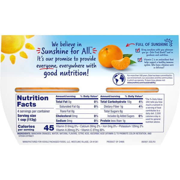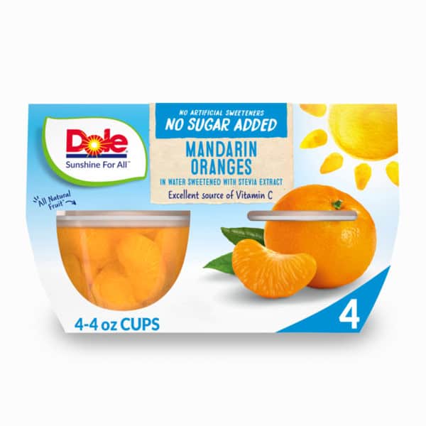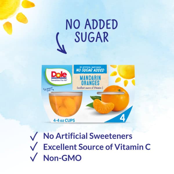 • DOLE® FRUIT BOWLS® Mandarin Oranges with No Sugar Added are an excellent source of Vitamin C, gluten free and made from all-natural fruit and non-GMO ingredients with no added sugar
