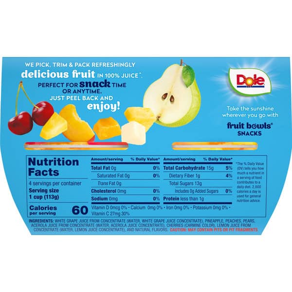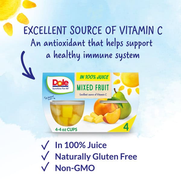 • DOLE® FRUIT BOWLS® Cherry Mixed Fruit in 100% juice are an excellent source of Vitamin C, gluten free and made from all-natural fruit and non-GMO ingredients