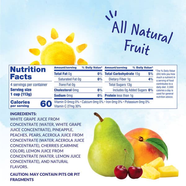 White Grape Juice From Concentrate (water, White Grape Juice Concentrate), Pineapple, Peaches, Pears, Cherries (red #3 Color), Lemon Juice From Concentrate (water, Lemon Juice Concentrate), Natural Flavors, Ascorbic Acid (to Promote Color Retention), And Citric Acid.