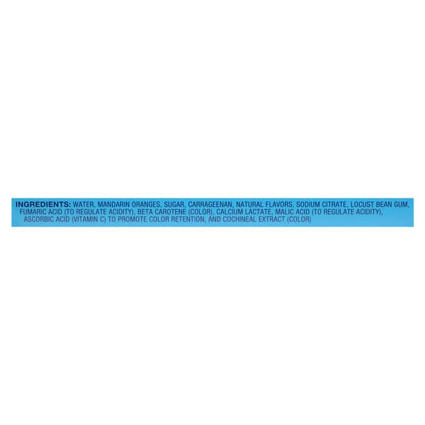 Water, Mandarin Oranges, Sugar, Carrageenan, Natural And Artificial Flavors, Sodium Citrate, Locust Bean Gum, Fumaric Acid, Calcium Lactate, Malic Acid, Ascorbic Acid (to Promote Color Retention), And Fd&c Yellow #6 (color).
