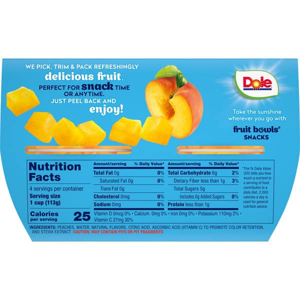 • DOLE® FRUIT BOWLS® Diced Peaches with No Sugar Added are an excellent source of Vitamin C, gluten free and made from all-natural fruit and non-GMO ingredients with no added sugar
