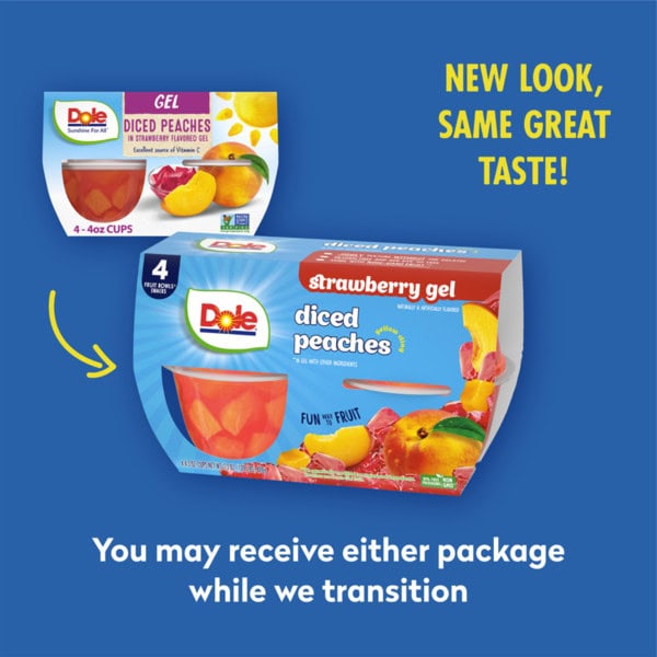• DOLE® FRUIT BOWLS® Peaches in Strawberry Flavored Gel are an excellent source of Vitamin C, gluten free and made from non-GMO ingredients