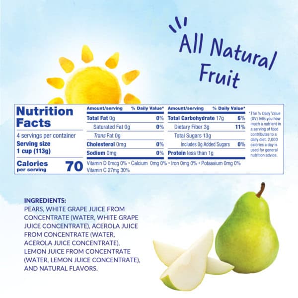 Pears, White Grape Juice From Concentrate (water, White Grape Juice Concentrate), Lemon Juice From Concentrate (water, Lemon Juice Concentrate), Ascorbic Acid (to Promote Color Retention), Natural Flavor, And Citric Acid.