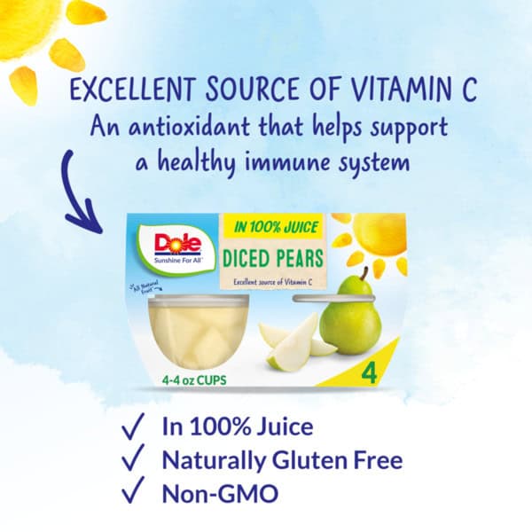 • DOLE® FRUIT BOWLS® Diced Pears in 100% Juice are an excellent source of Vitamin C, gluten free and made from all-natural fruit and non-GMO ingredients