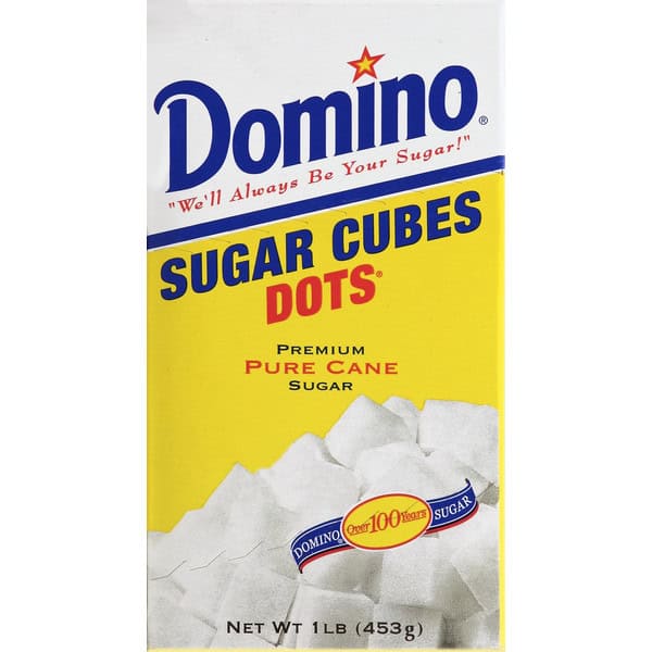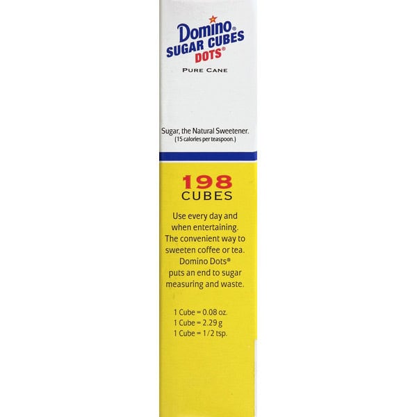 Premium pure cane sugar. 198 cubes. We’ll always be your sugar! Over 100 years. Sugar is a 100% natural simple carbohydrate. Carbohydrates are an important part of any balanced diet. Sugar contains no fat or cholesterol and has 15 calories per teaspoon. www.dominosugar.com. Sugar, the natural sweetener. (15 calories per teaspoon). Use every day and when entertaining. The convenient way to sweeten coffee or tea. Domino Dots puts an end to sugar measuring and waste. Questions or Comments? Call: 1-800-729-4840. Pure sugar.