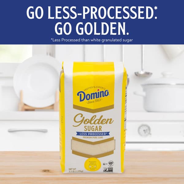Domino® Golden Sugar is a less processed sugar than white granulated sugar that you can use in all your favorite foods. Made from pure cane sugar, it bakes, dissolves and measures cup-for-cup just like white granulated sugar, but has a beautiful golden color and a hint of molasses flavor you’re sure to love.