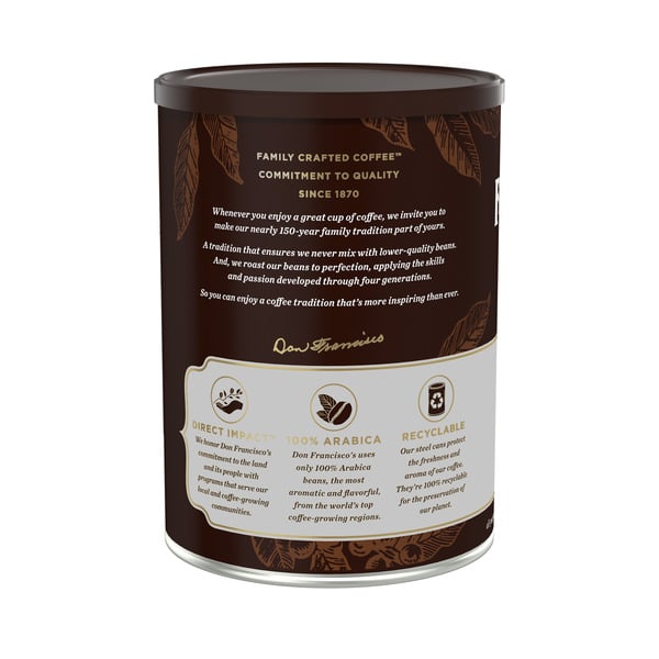 Since 1870. The very best of the highly-prized Columbians, roasted to enhance the brightness of this coffee. Four generations of master roasting. All-purpose grind. Each coffee-growing country offers many grades of coffee, some excellent and some not. But a country’s reputation is always built on its very best grade. Many brands mix poor-quality coffee beans with good ones to keep costs down. That’s why a coffee lover can be so pleased with one cup, and so disappointed with another. We never mix the quality of coffee. We choose the very highest grade of beans from the best coffee-growing countries, and we keep them pure. Then we roast them in a way that brings out their unique flavor, just the way my family has for over 135 years. So if you want coffee that’s built the reputation, it’s inside. We hope each country’s best will give you the pleasure only a great cup of coffee can. Don Francisco. Sustainability. Don Francisco taught us to respect and honor the land and its people. That principle is in every aspect of our business today. We are committed to improving the way our coffee-growing partners care for their land, and to enriching their communities through education and healthcare programs. Single origin. This single-origin coffee is a gift from a prized growing region. Each coffee is born in rich, fertile soils, raised in special micro-climates, and is branch-ripened and hand-picked. It’s the best of a region, and roasted to deliver its unique flavor treasure. 100% Arabica. Of the two main varieties of coffee, Arabica beans brew a more aromatic and flavorful beverage. The great coffees of the world, such as Colombian and Kona, are Arabicas. These more-flavorful beans appear in stores as whole bean, and in high-quality ground coffees.