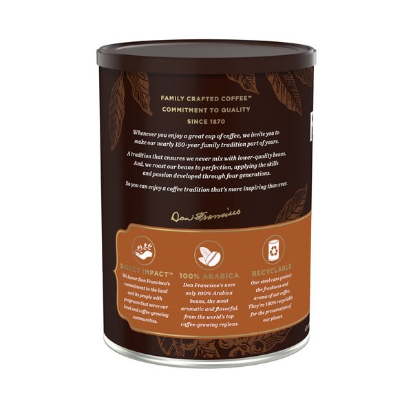 Since 1870. Like a spicy dessert, this cup of coffee has a nutty flavor and a sweet scent of cinnamon. Natural & artificially flavored. Whenever you enjoy a great cup of coffee, we invite you to make our nearly 150-year family tradition part of yours. A tradition that ensures we never mix with lower-quality beans. And, we roast our beans to perfection, applying the skills and passion developed through four generations. So you can enjoy a coffee tradition that’s more inspiring than ever. Direct Impact: We honor Don Francisco’s commitment to the land and its people with programs that serve our local and coffee-growing communities. 100% Arabica: Don Francisco’s uses only 100% arabica beans, the most aromatic and flavorful, from the world’s top coffee-growing regions. Recyclable: Our steel cans protect the freshness and aroma of our coffee. They’re 100% recyclable for the preservation of our planet. Learn more about our family crafted coffee at: www.donfranciscos.com.