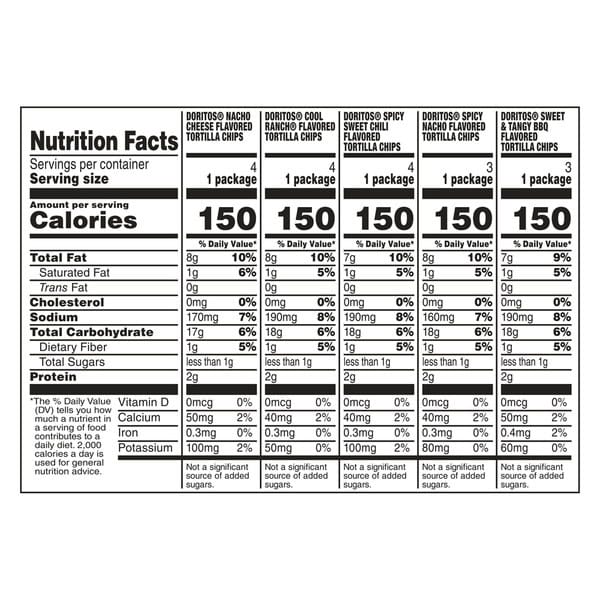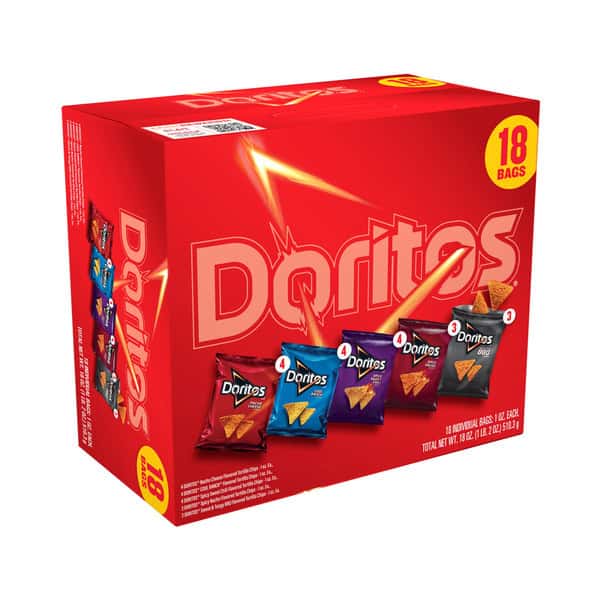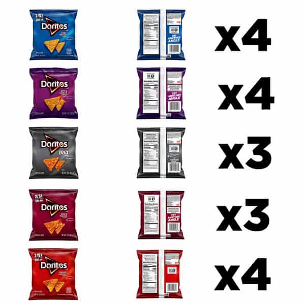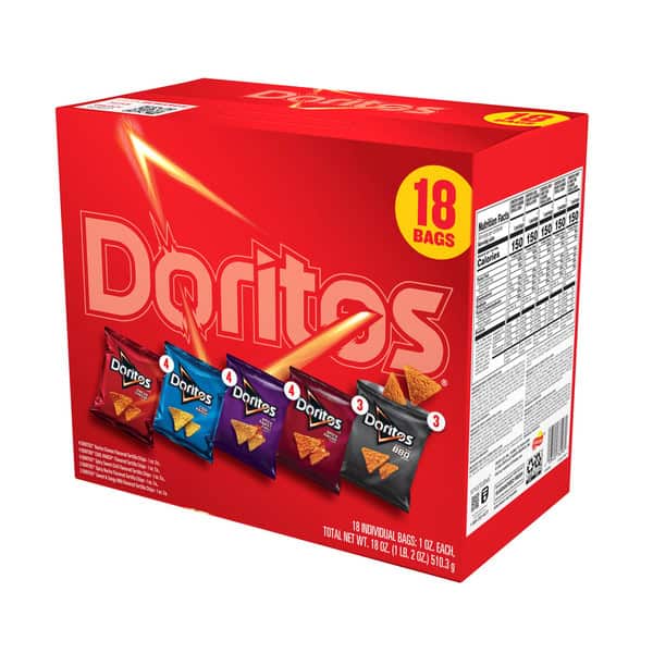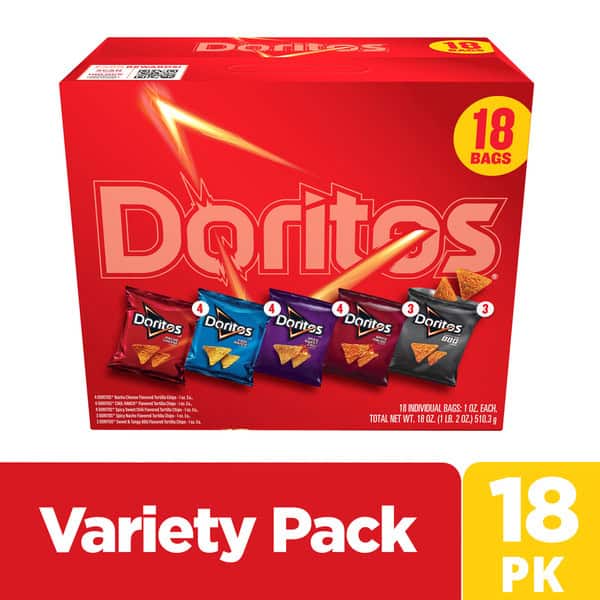 • Includes 18 (1 oz) single serve bags of Doritos Tortilla Chips: (4) Nacho Cheese, (4) Cool Ranch, (4) Spicy Sweet Chili, (3) Spicy Nacho, (3) Sweet & Tangy BBQ