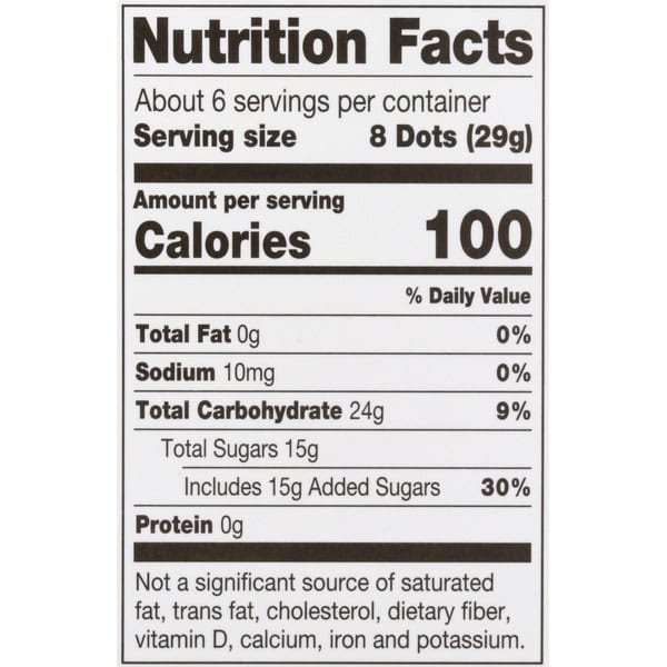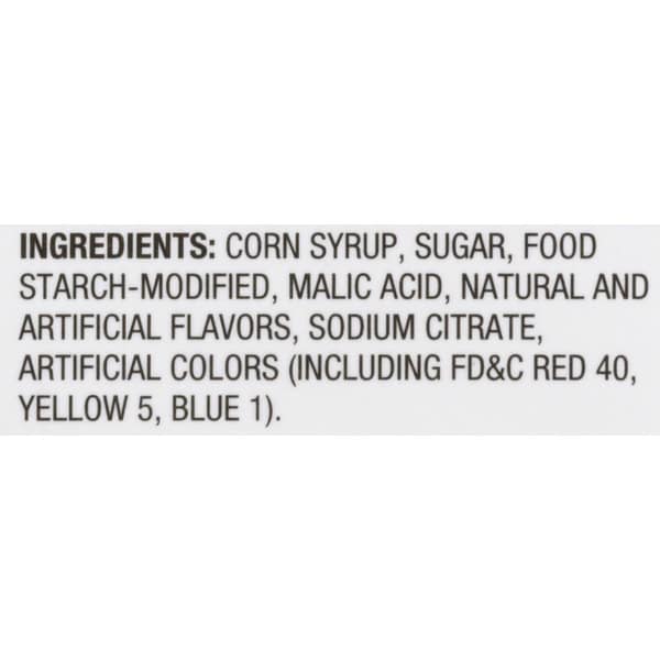 Corn Syrup, Sugar, Food Starch-modified, Malic Acid, Natural And Artificial Flavors, Sodium Citrate, Artificial Colors (including Fd&c Red 40, Yellow 5, Blue 1).