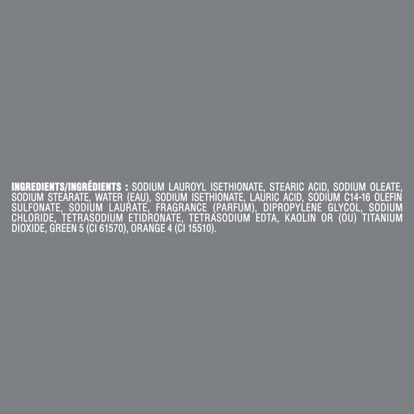 Sodium Lauroyl Isethionate, Stearic Acid, Sodium Tallowate Or Sodium Palmitate, Water (aqua), Sodium Isethionate, Lauric Acid, Sodium C14-16 Olefin Sulfonate, Sodium Cocoate Or Sodium Palm Kernelate, Fragrance, Dipropylene Glycol, Sodium Chloride, Propylene Glycol, Tetrasodium Edta, Tetrasodium Etidronate, Green 5 (ci 61570), Orange 4 (ci 15510), Titanium Dioxide (ci 77891)