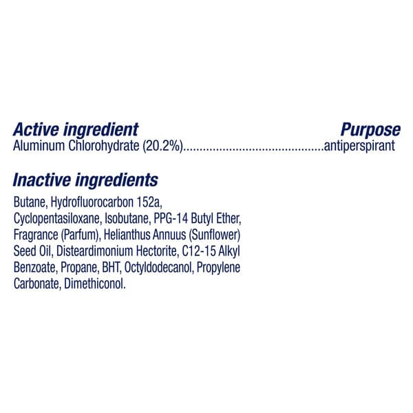 Inactive Ingredients: Butane, Hydrofluorocarbon 152a, Cyclopentasiloxane, Isobutane, Ppg-14 Butyl Ether, Glycine, Fragrance, Helianthus Annuus (sunflower) Seed Oil, C12-15 Alkyl Benzoate, Disteardimonium Hectorite, Calcium Chloride, Propane, Bht, Octyldodecanol, Propylene Carbonate, Dimethiconol, Alpha-isomethyl Ionone, Benzyl Alcohol, Benzyl Salicylate, Cinnamyl Alcohol, Coumarin, Eugenol, Hexyl Cinnamal, Limonene, Linalool