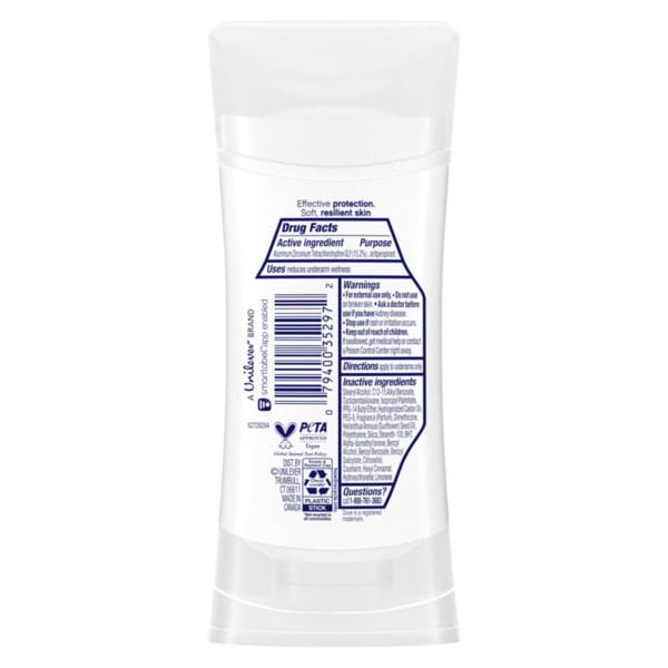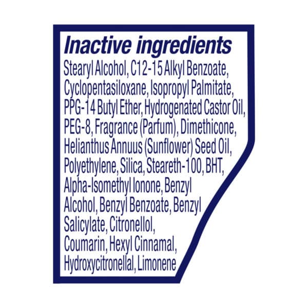 Inactive Ingredients: Cyclopentasiloxane, Stearyl Alcohol, C12-15 Alkyl Benzoate, Ppg-14 Buty Ether, Hydrogenated Castor Oil, Glycine, Peg-8, Calcium Chloride, Fragrance, Dimethicone, Polyethylene, Silica, Helianthus Annus (sunflower) Seed Oil, Steareth-100, Stearic Acid, Bht, Alpha-isomethyl Lonone, Benzyl Alcohol, Citra, Citronellol, Coumarin, Geraniol, Hexyl Cinnamal, Hydroxycitronellal, Limonene, Linalool