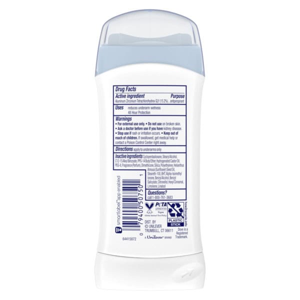 For soft, smooth underarms and invisible protection that lasts 48H, look no further than Dove Invisible Solid Powder Antiperspirant Deodorant Stick. Formulated with ¼ moisturizers, this antiperspirant deodorant for women leaves your underarm skin feeling soft and smooth. The 0% alcohol (ethanol) formula helps your underarm skin recover from irritation caused by shaving, too. And it doesn’t stop there. This deodorant stick gives you 48H antiperspirant protection from underarm sweat and odor, has a powdery scent that indulges your senses throughout the day, and glides on for easy application. Plus, it’s invisible and leaves no white marks behind, so you can stay fresh, comfortable and confident all day long. To get the most out of your antiperspirant deodorant stick, swipe it over cool, dry underarms two or three times until an even layer is applied. Its invisible solid format means you can get dressed and go, without worrying about deodorant stains. At Dove, our vision is of a world where beauty is a source of confidence, and not anxiety. So, we are on a mission to help the next generation of women develop a positive relationship with the way they look – helping them raise their self-esteem and realize their full potential. Globally, Dove does not test on animals, so all of our antiperspirant deodorants are cruelty-free and certified by PETA for added peace of mind.