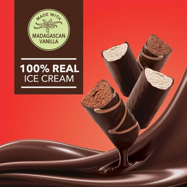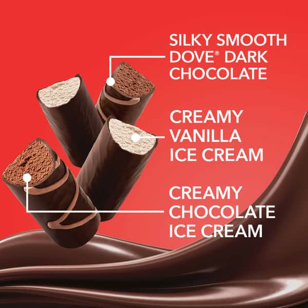 •Unwind with our cool and creamy miniature treats made with rich vanilla and chocolate ice cream, coated in thick premium DOVE dark chocolate