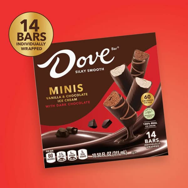 •Contains one (1) 14-piece box of assorted DOVE Dark Chocolate Coated Mini Vanilla and Chocolate Ice Cream Bars Variety Pack
