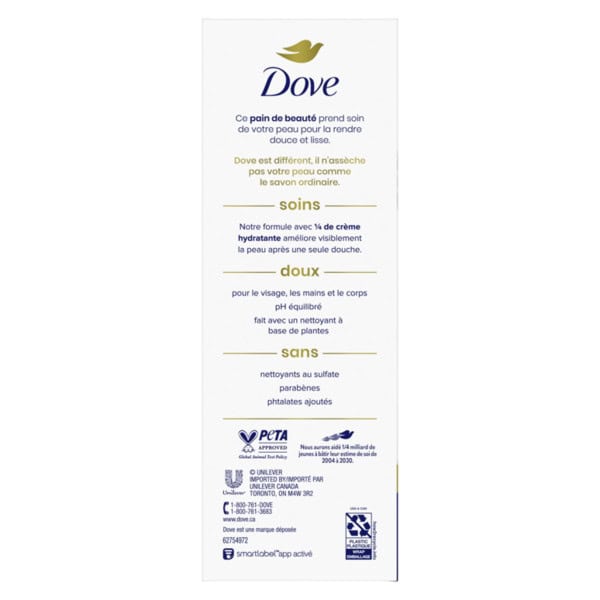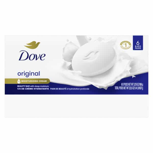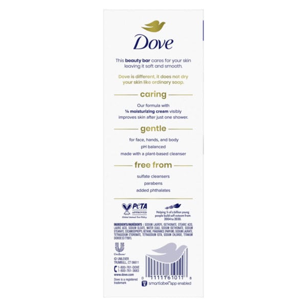 This Dove Beauty Bar offers a caring cleansing experience. Unlike ordinary bar soap, the Dove Beauty Bar is made with 1/4 moisturizing cream to deeply nourish skin and help prevent dryness. This cleansing bar is uniquely created with 1/4 moisturizing cream and a plant-based cleanser for skin care that maintains pH balance and the natural skin barrier. This gentle skin cleanser is multi-purpose: gently washing away dirt and oil while moisturizing and nourishing the skin. It is gentle enough for use on face, hands, and body, as a facial cleanser and body soap bar. To use this Original Beauty Bar, wet your hands and gently lather the Beauty Bar between them, then apply the lather to your face or body before rinsing thoroughly with water. As the #1 dermatologist recommended bar brand, the Dove Beauty Bar formula is free from sulfate cleansers, parabens, and phthalates. Dove believes real beauty is cruelty-free. Globally, Dove does not test on animals and is certified as PETA Approved. Through the Dove Self-Esteem Project, Dove helps parents, mentors, teachers, and youth leaders deliver self-esteem education that’s reached more than 60 million young people so far. By 2030, their mission is to have helped ¼ billion build positive body confidence.