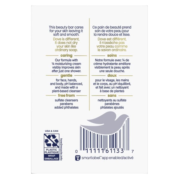 This Dove Beauty Bar offers a caring cleansing experience. Unlike ordinary bar soap, the Dove Beauty Bar is made with 1/4 moisturizing cream to deeply nourish skin and help prevent dryness. This cleansing bar is uniquely created with 1/4 moisturizing cream and a plant-based cleanser for skin care that maintains pH balance and the natural skin barrier. This gentle skin cleanser is multi-purpose: gently washing away dirt and oil while moisturizing and nourishing the skin. It is gentle enough for use on face, hands, and body, as a facial cleanser and body soap bar. To use this Original Beauty Bar, wet your hands and gently lather the Beauty Bar between them, then apply the lather to your face or body before rinsing thoroughly with water. As the #1 dermatologist recommended bar brand, the Dove Beauty Bar formula is free from sulfate cleansers, parabens, and phthalates. Dove believes real beauty is cruelty-free. Globally, Dove does not test on animals and is certified as PETA Approved. Through the Dove Self-Esteem Project, Dove helps parents, mentors, teachers, and youth leaders deliver self-esteem education that’s reached more than 60 million young people so far. By 2030, their mission is to have helped ¼ billion build positive body confidence.