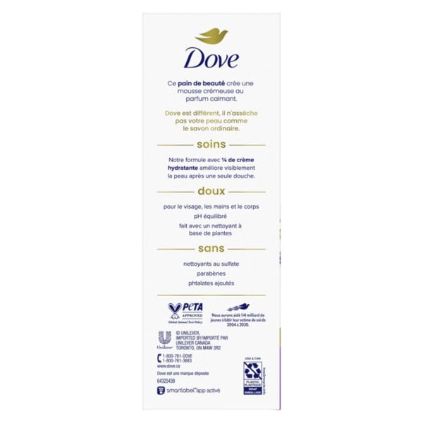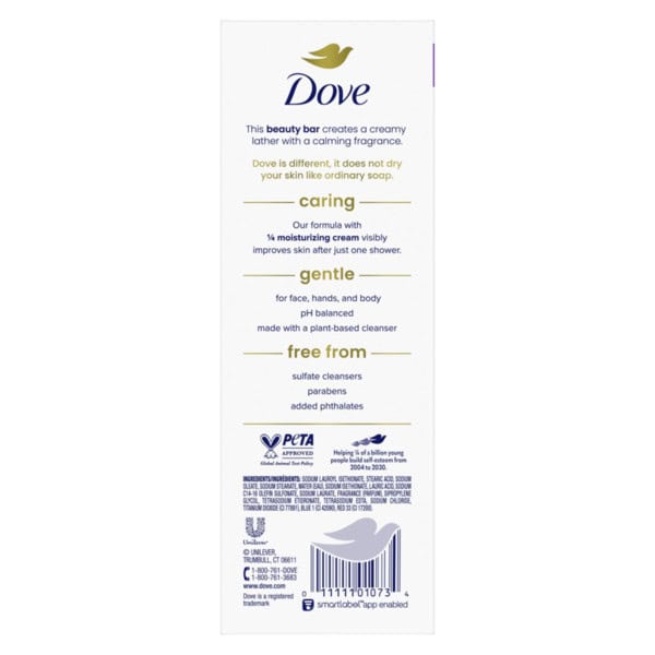 This Dove Beauty Bar offers a relaxing cleansing experience with creamy lather. Unlike ordinary bar soap, the Beauty Bar is made with 1/4 moisturizing cream to deeply nourish skin and prevent dryness. This cleansing bar is uniquely created with 1/4 moisturizing cream and a plant-based cleanser for skin care that maintains pH balance and the natural skin barrier. Made with lavender oil & chamomile, this gentle skin cleanser is multi-purpose: gently washing away dirt and oil while calming the skin. It is gentle enough for use on face, hands, and body, allowing it to be used as a facial cleanser as well as body soap bar. To use this Relaxing Beauty Bar, wet your hands and gently lather the Beauty Bar between them, then apply the lather to your face or body before rinsing thoroughly with water. As the #1 dermatologist recommended bar brand, the Dove Beauty Bar formula is free from sulfate cleansers, parabens, and phthalates. Dove believes real beauty is cruelty-free. Globally, Dove does not test on animals and is certified as PETA Approved. Through the Dove Self-Esteem Project, Dove helps parents, mentors, teachers, and youth leaders deliver self-esteem education that’s reached more than 60 million young people so far. By 2030, their mission is to have helped ¼ billion build positive body confidence.