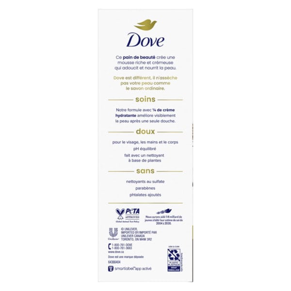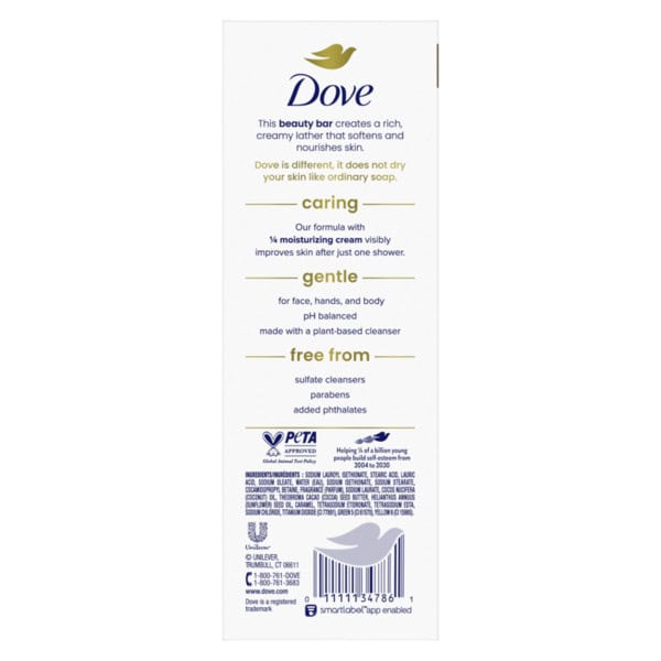 This Dove Beauty Bar offers a nourishing & restoring cleanse. Unlike ordinary bar soap, the Beauty Bar is made with 1/4 moisturizing cream to deeply nourish skin and prevent dryness. This cleansing bar is uniquely created with 1/4 moisturizing cream and a plant-based cleanser for skin care that maintains pH balance and the natural skin barrier. Made with coconut & cocoa butter, this gentle skin cleanser is multi-purpose: gently washing away dirt and oil while nourishing and leaving skin feeling soft and smooth. It is gentle enough for use on face, hands, and body, allowing it to be used as a facial cleanser as well as body soap bar. To use this Restoring Beauty Bar, wet your hands and gently lather the Beauty Bar between them, then apply the lather to your face or body before rinsing thoroughly with water. As the #1 dermatologist recommended bar brand, the Dove Beauty Bar formula is free from sulfate cleansers, parabens, and phthalates. Dove believes real beauty is cruelty-free. Globally, Dove does not test on animals and is certified as PETA Approved. Through the Dove Self-Esteem Project, Dove helps parents, mentors, teachers, and youth leaders deliver self-esteem education that’s reached more than 60 million young people so far. By 2030, their mission is to have helped ¼ billion build positive body confidence.