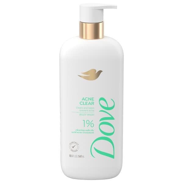 New dove acne clear body wash, with 1% clearing salicylic acid, deeply cleans your skin while purifying pores to reduce and help prevent acne breakouts. Watch as this clear, refreshing gel body wash transforms into bubbly lather, while filling your shower with fresh & herbal notes.