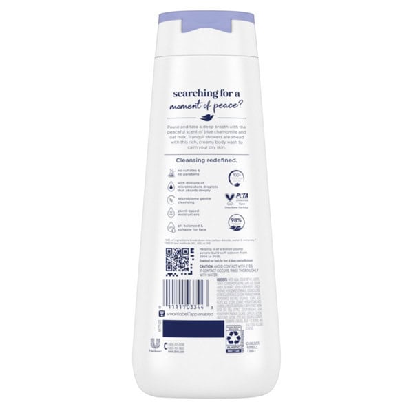 Raise your hand if you could use a little peace and quiet after a long day. While it’s up, grab that Dove Anti-Stress Body Wash and head over to the shower for a much-needed break from the day. And a much-needed pick me up for your skin. As the rich, creamy formula gently cleanses, it also deeply moisturizes with skin-natural nourishers, skin-loving plant-based moisturizers, and millions of 24hr Renewing MicroMoisture™️ droplets. And what do those little guys do? They’re specially designed to absorb deeply and work with your skin’s natural renewal process to help retain and boost moisture for renewed, nourished, and healthy-looking skin that lasts all day. And guess what else is renewed? Your subscription to calm and peace of mind from a fragrance retreat centered by tranquil blue chamomile cushioned with warm frothy oat milk. Like a nice relaxing tea before bedtime. To use this rich, creamy body wash, squeeze into palms or loofah, massage into skin, relax to the max, let the lather soak in, rinse and step out of shower feeling renewed and silky-soft. Who else would you trust, but the #1 dermatologist-recommended brand (us!) to deliver a long-lasting, nourishing body wash? Our Anti-Stress Blue Chamomile & Oat Milk Body Wash is vegan and Dove is PETA approved, meaning we do not test on animals anywhere in the world. Plus, it’s sulfate-free, paraben-free, and packaged in 100% recycled bottles.