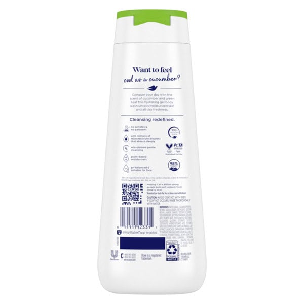 Deeply nourish your dry skin with Dove Refreshing Body Wash. This nourishing body wash, with 24hr Renewing MicroMoisture, deeply nourishes and hydrates the skin, leaving it renewed and healthy-looking for 24 hours. From the #1 dermatologist-recommended body wash brand, this refreshing body wash has a luxurious lather you’ll love to use in the shower after a long day. Dove Refreshing Cucumber and Green Tea Body Wash has been developed with millions of MicroMoisture droplets and plant-based moisturizers, creating a formula that works to gently cleanse and moisturize skin and nourish your microbiome – skin’s living protective layer. This refreshing body wash, infused with cucumber and green tea, deeply nourishes dry skin. As a specially designed body wash for soft skin, your skin will feel as soft as it looks. This body wash for dry skin also has a 98% biodegradable formula*. *98% of ingredients break down into carbon dioxide, water and minerals (OECD test methods 301, 302 and/or 310). This gentle skin cleanser is packaged in 100% recycled plastic bottles, vegan, and Dove is PETA approved, meaning we do not test on animals, anywhere in the world, so you can feel good about switching to Dove. Plus, this refreshing body wash is made without sulfates or parabens. How to use: To soften and renew your skin with this fresh body wash, squeeze a generous amount of Dove Refreshing Cucumber and Green Tea Body Wash into your palms. Massage the hydrating body wash onto your skin, taking a moment to enjoy the rich lather and indulgent fragrance, before rinsing off to reveal soft, smooth skin. Dove care goes further than moisturizing skin care with 100% recycled plastic bottles and, globally, Dove is PETA approved. At Dove, our vision is of a world where beauty is a source of confidence, and not anxiety. So, we are on a mission to help the next generation of women develop a positive relationship with the way they look—reaching over ¼ of a billion young people with self-esteem education by 2030. We are also committed to a landmark new initiative as part of our 2025 commitment to reduce plastic waste; reducing over 20,500 metric tons of virgin plastic annually by making the iconic beauty bar packaging plastic-free globally; launching new 100% recycled plastic bottles; and trialing a new refillable deodorant format that reduces plastic use over time. As one of the largest beauty brands in the world, we are revealing an agenda-setting commitment to tackle the global beauty industry’s plastic waste issue.